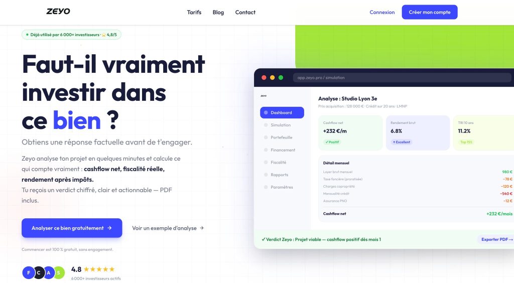 Concrètement, ZEYO permet de simuler en quelques clics la rentabilité nette d’un bien immobilier en intégrant l’ensemble des paramètres qui comptent vraiment : prix d’achat, frais de notaire, charges, travaux, fiscalité. La plateforme permet également de comparer différentes stratégies locatives location nue, meublée LMNP, courte durée de type Airbnb, bail mobilité et s’appuie sur des données de marché actualisées pour affiner les projections.